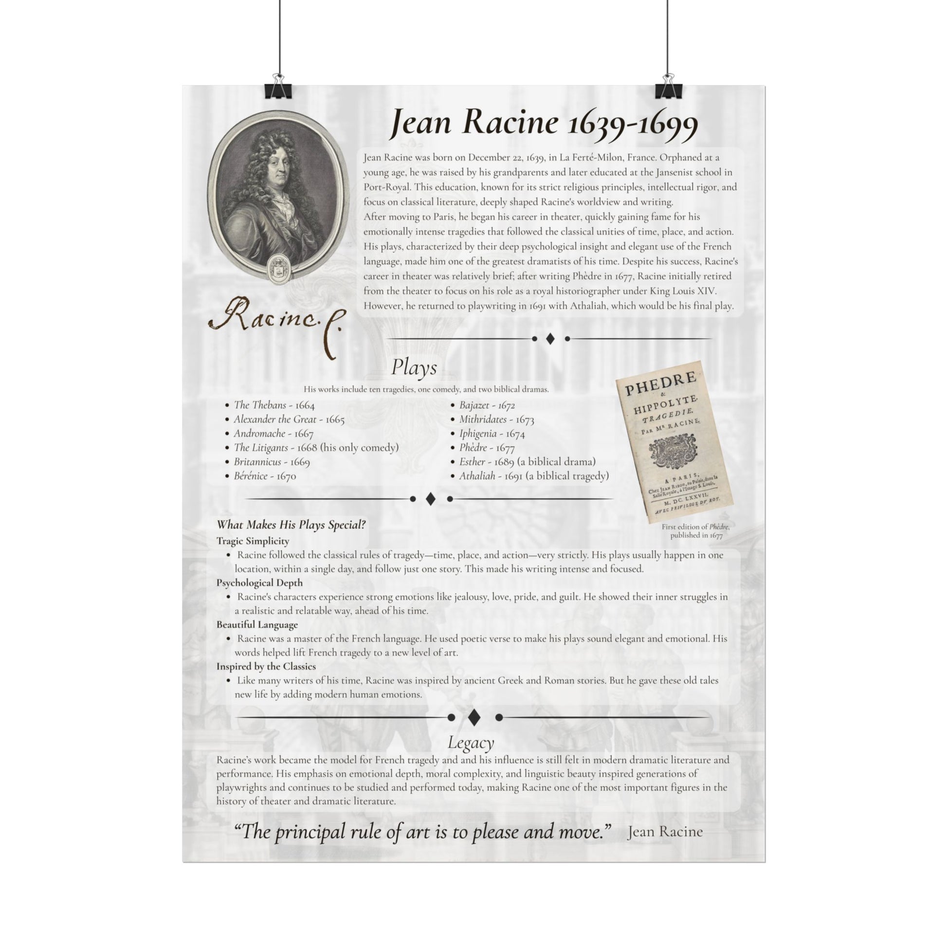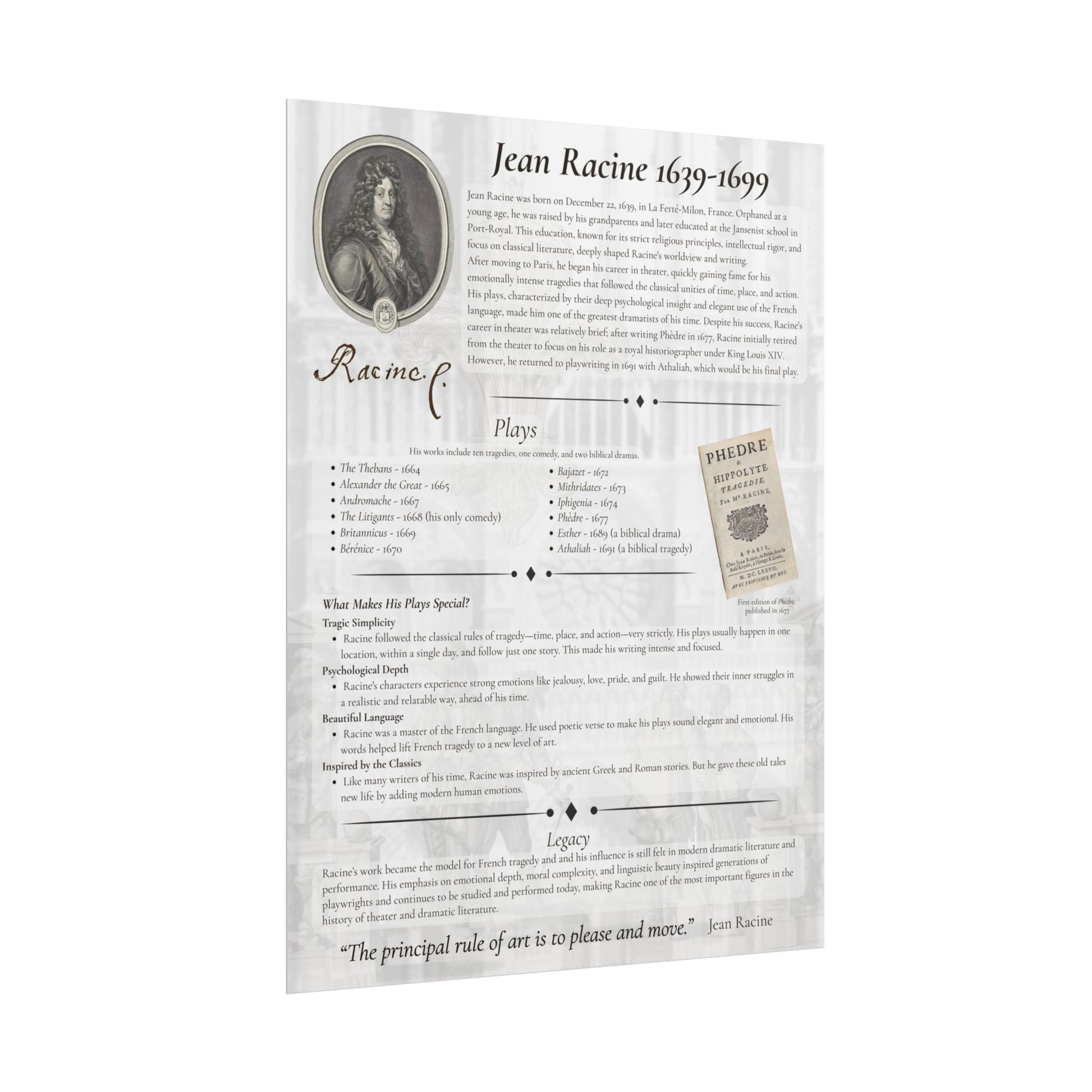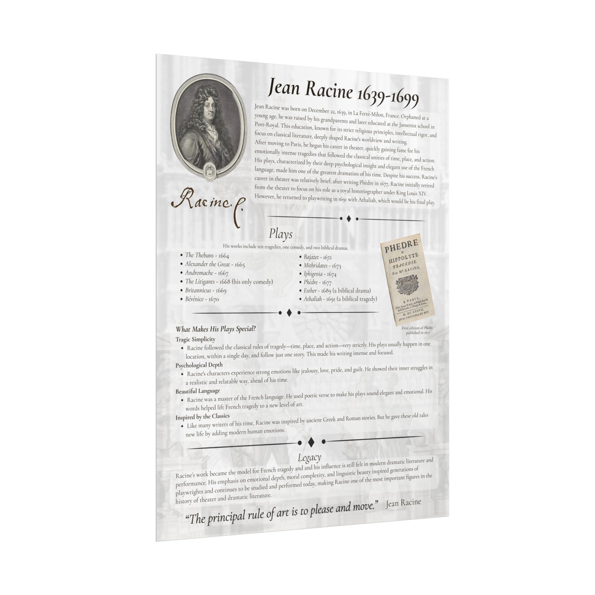 Jean Racine Tragedy Poster - French Neoclassical Drama Educational Print for Theater and Literature Lovers (18x24 or 24x36)