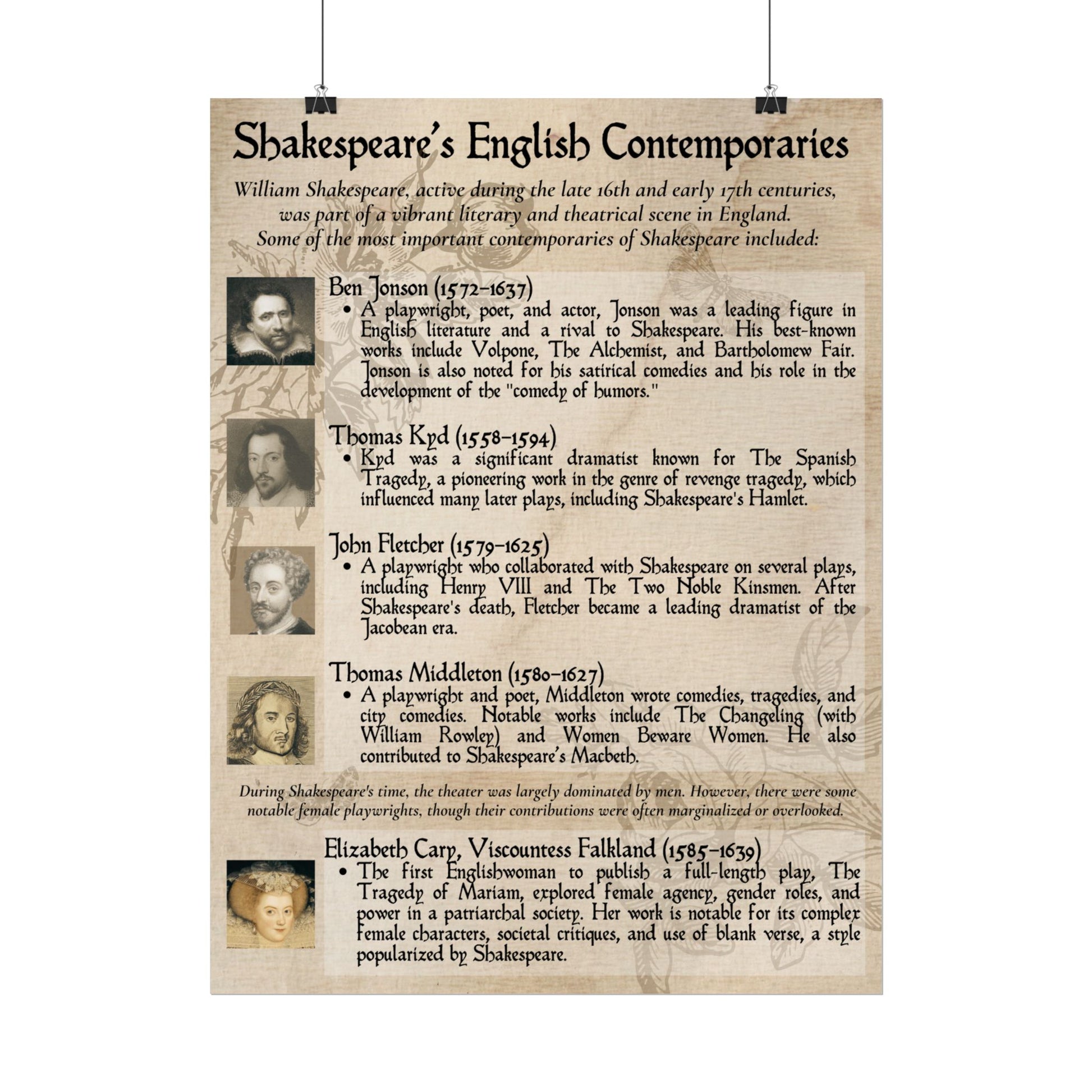 This poster is perfect for history buffs and literature enthusiasts, featuring one of two posters introducing the other playwrights working in London during Shakespeare's time. The semi-glossy paper options ensure sharp color fidelity, archival quality, and a textured surface. Bright and intense colors that won't fade make this poster a must-have for anyone interested in Renaissance-era playwrights.