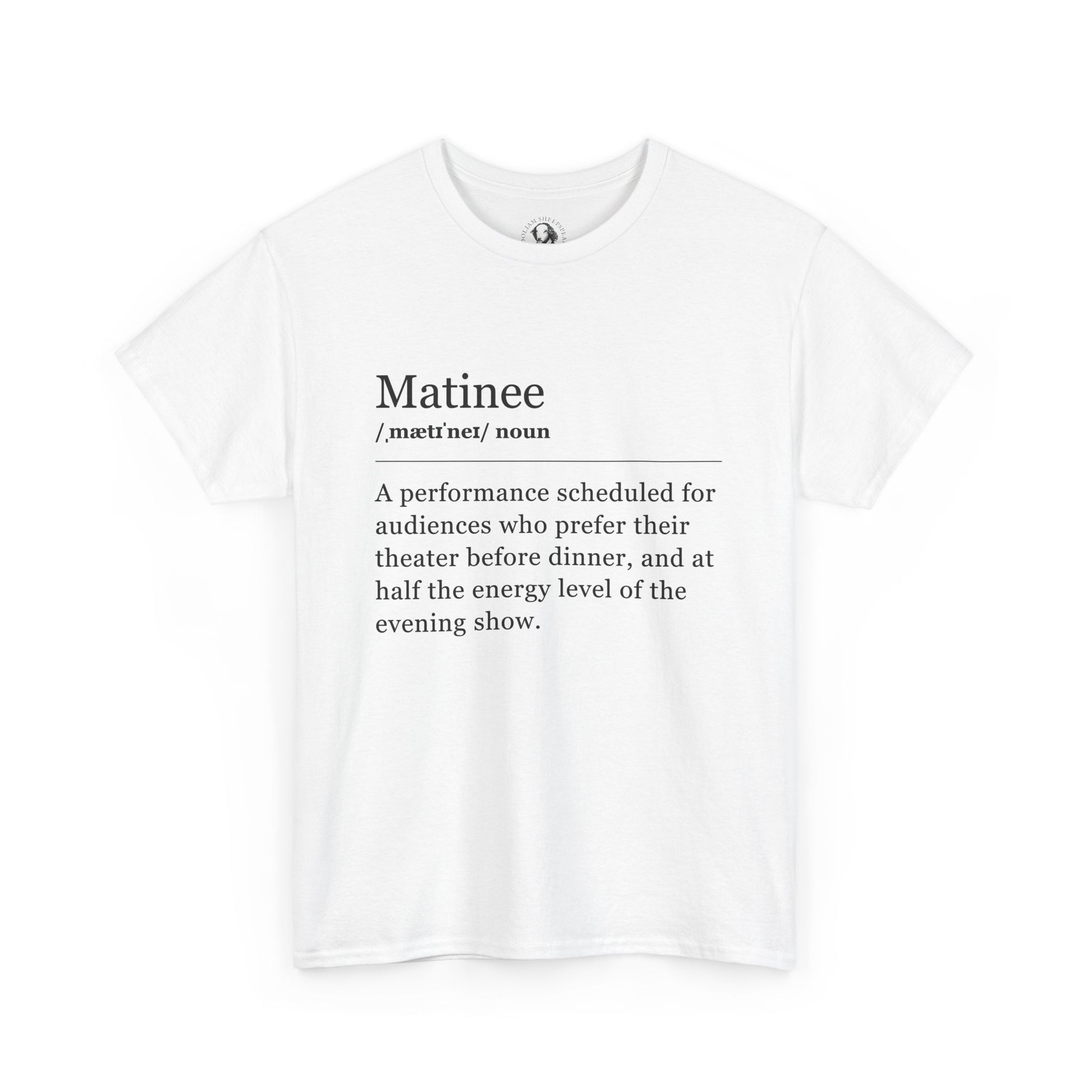 ☀️ Matinee Definition Tee – Unisex Heavy Cotton Shirt Matinee (n.): A performance scheduled specifically for audiences who prefer their theater before dinner, and at half the energy level of the evening show. It’s the show where the actors caffeinate harder, the applause is polite, and the vibe is a little… softer. This witty tee is perfect for performers, ushers, and theatergoers who know that matinee energy is a very real thing.